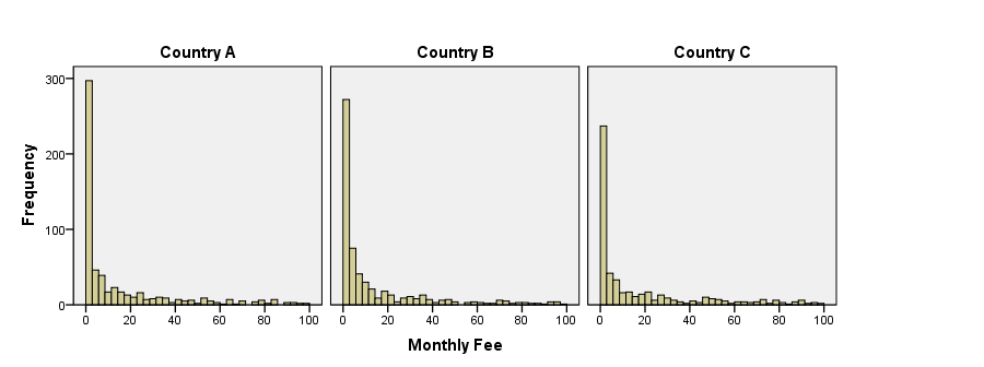 The main goal of a CBC study run in three East-European countries (A, B and C) was to estimate potential of a special telecommunication service. Choice selectivity and propensity to a class of tariff were by-products of the survey.